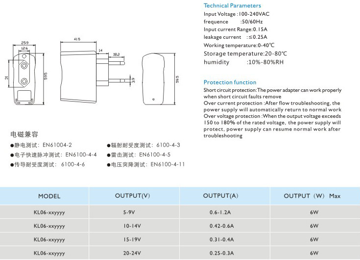 頻率:50/60Hz 輸入電流:0.15A 漏電電流:≤0.25A 工作溫度:0-40℃ 貯藏溫度:-20-80℃ 濕度:10%-80%RH 短路保護(hù): 電源適配器在短路解除時能正常工作恢復(fù) 過流保護(hù):過流故障排除后,電源將自動恢復(fù)正常工作 過壓保護(hù):當(dāng)輸出電壓超過額定電壓的150-180%時,電源將保護(hù),故障排除后電源能恢復(fù)正常工作" />